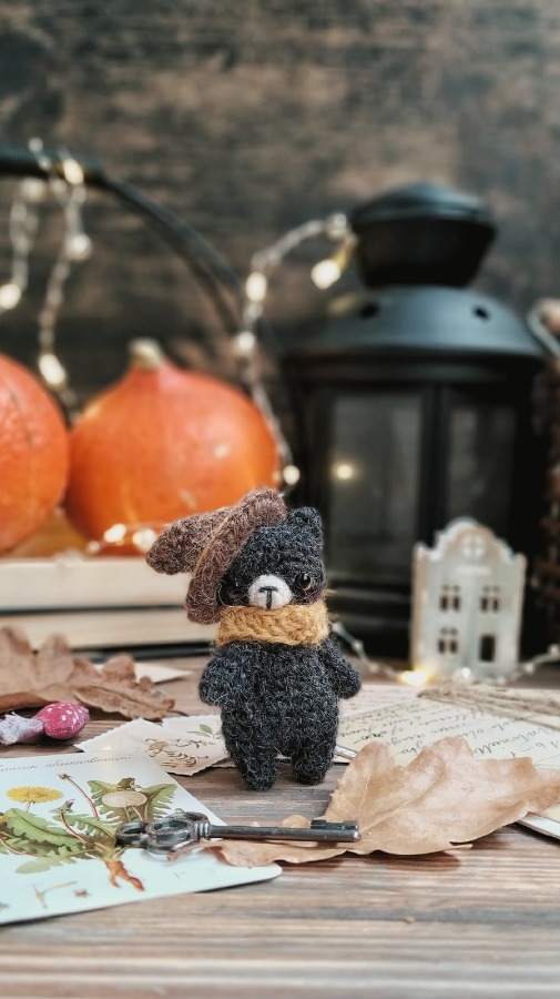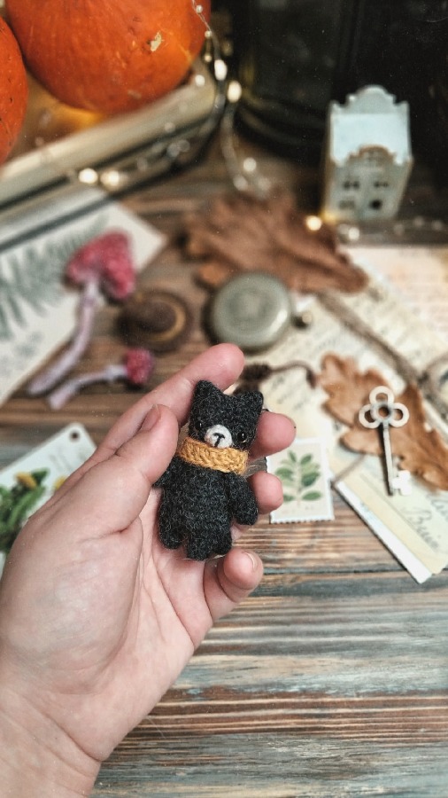 2-3 ряды — по 7 сбн, у первой ноги обрезать нить, закрепить ее и спрятать кончик, у второй ноги набрать 5 вп и присоединить к первой лапке, далее продолжаем вязать тельце;
