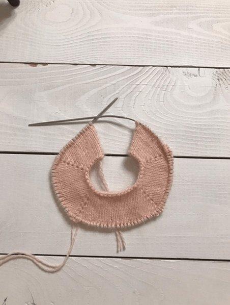 15 ряд: кр, 15 лиц, закрываем 18 петель, 28 лиц, закрываем 18 петель, 15 лиц, кр (регланные петли провязываю в полочки и перед)