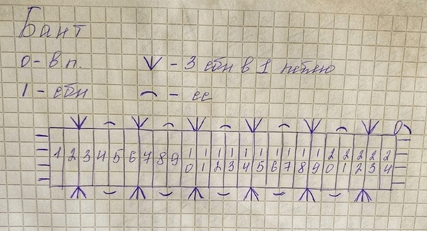 Для бантика набираем цепочку из 4 в.п. + 1 в.п.п., затем вяжем поворотными рядами до нужной длины ( у меня вышло 24 ряда). Меняем нить и обвязываем полотно по схеме (см. фото), крючок вводим через каждые 2 ряда, боковые стороны обвязываем сбн, вводя крючок в каждую петлю предыдущего ряда. Затем сшиваем боковые части и обматываем середину бантика этой же нитью, пришиваем.