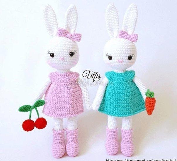 Миленькие девочки зайчики, связанные крючком. Они — настоящие леди — в платьицах, с бантиками и длинными ресничками.
