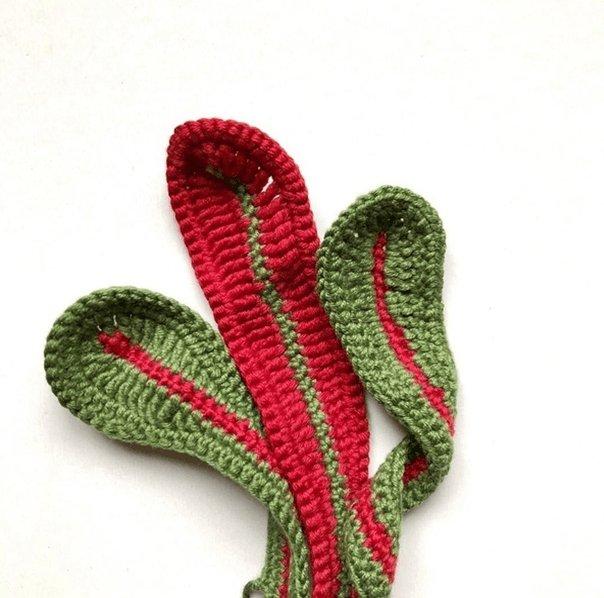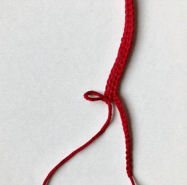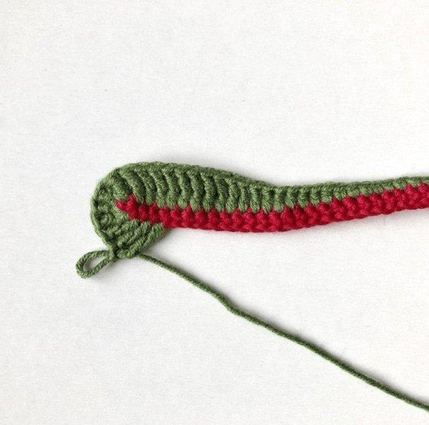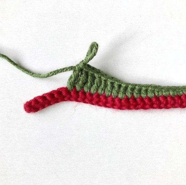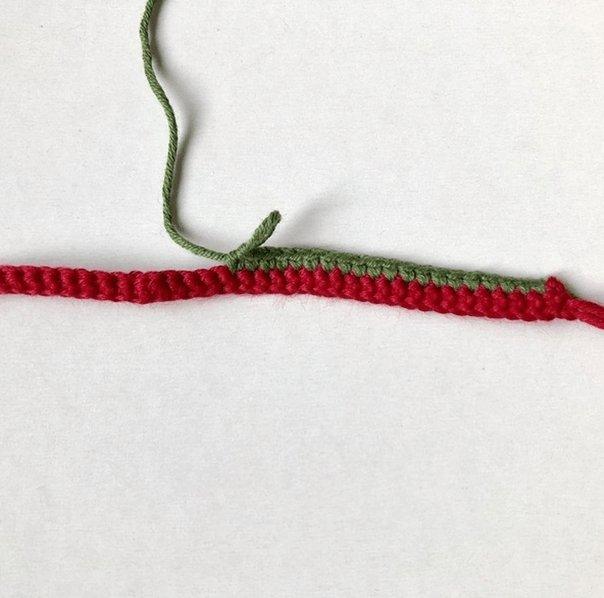 Набрать цепочку из 40 воздушных петель, далее по ней провязываем 39 сбн, воздушная петля, меняем нить на зелёную, разворачиваем вязание.