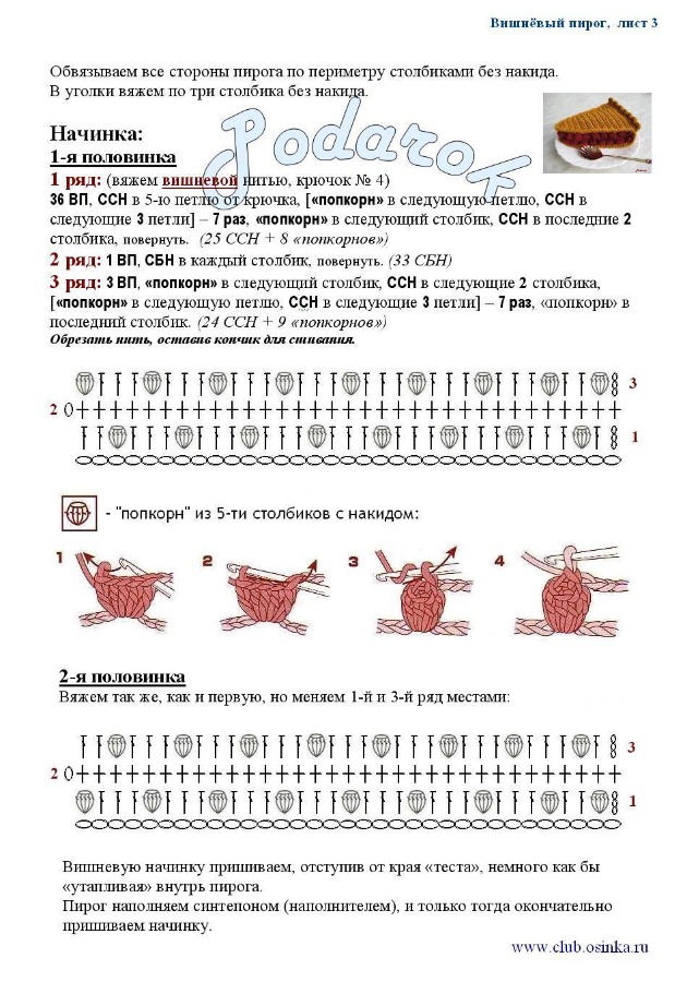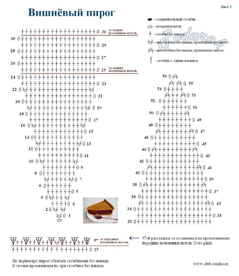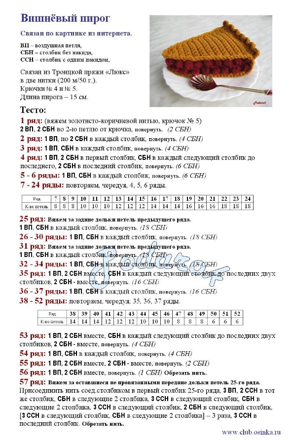 Связан из Троицкой пряжи «Люкс» (200 м/50 г.) в две нити. Крючки № 5 и № 4. Длина пирога – 15 см.