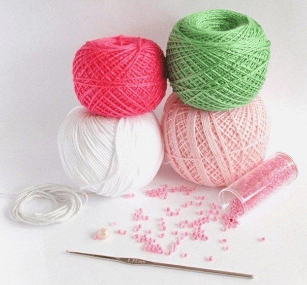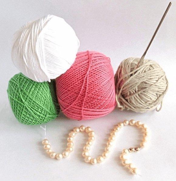 Это хлопковая пряжа, крючок №1,75 и жемчуг…