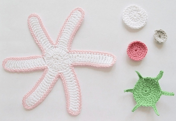 Вначале сложите вместе 3 детали серединки и пришейте их друг к другу, затем добавьте жемчужинку. Все это присоедините к центру основы невидимыми стежками. Теперь вденьте в иглу с большим ушком белую нить («Ирис»). Загните каждый лепесток основы к изнанке и аккуратно пришейте. В конце — пришейте белую подложку, к которой прикрепите качественную резинку для волос. Новое украшение готово!