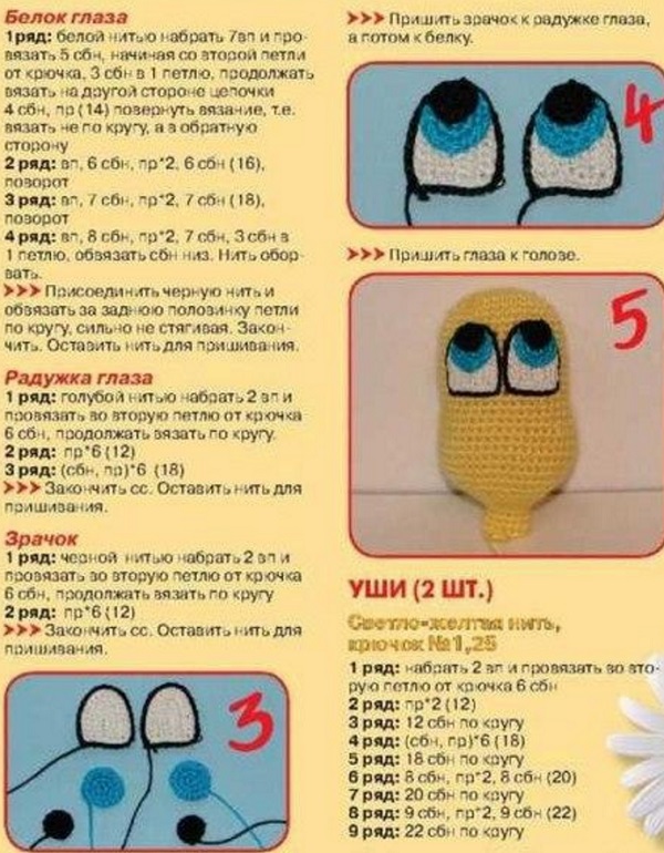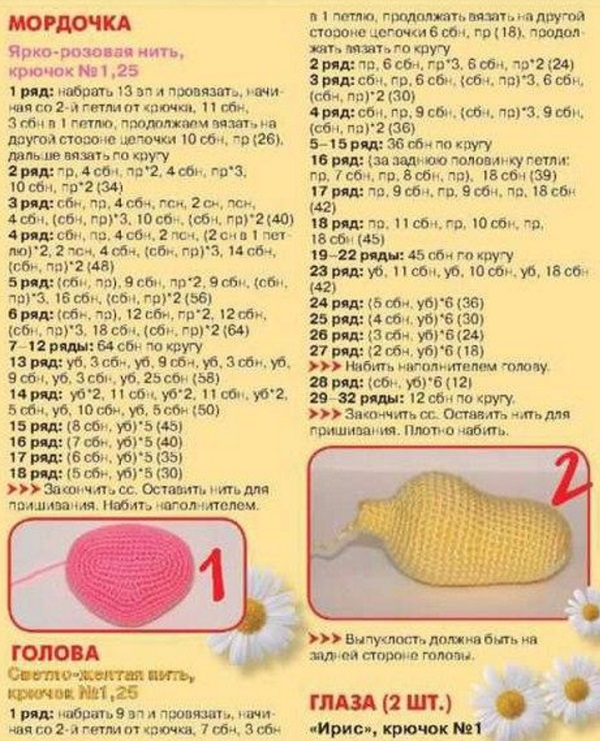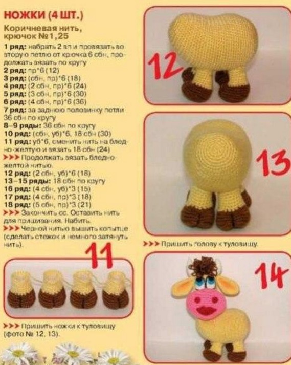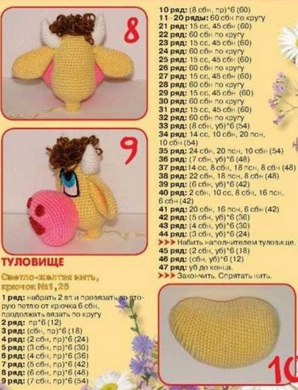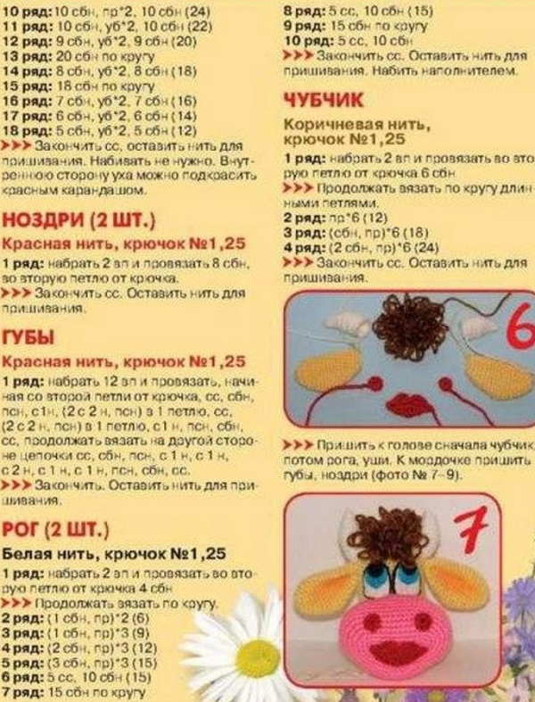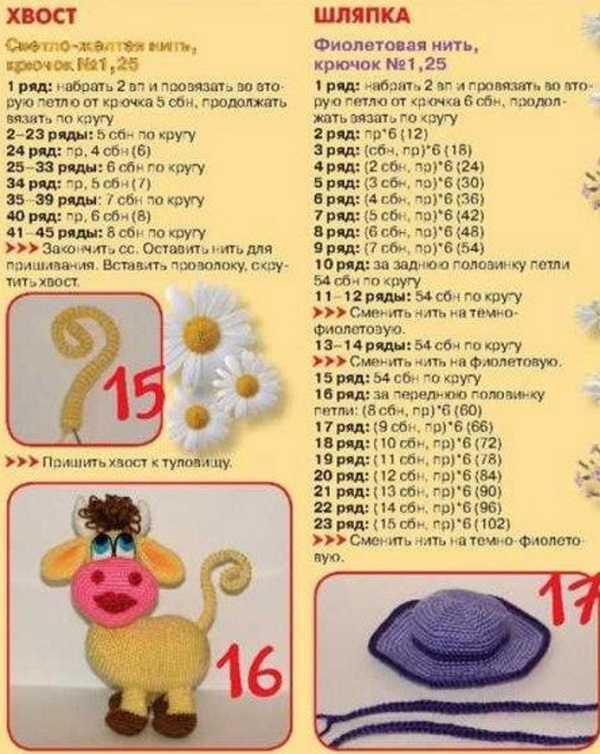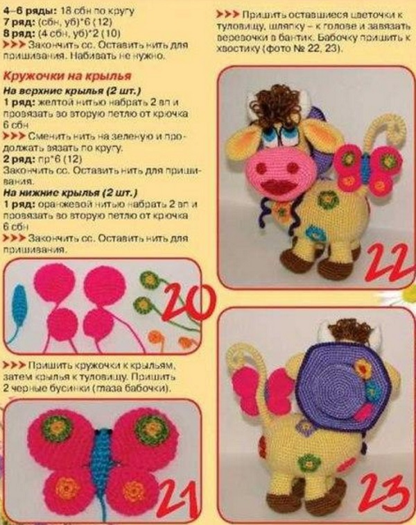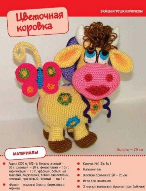 Веселая разноцветная корова связана крючком. Корова получилась очень жизнерадостная и оптимистичная. Бока коровы украшены цветами, а на хвосте сидит огромная бабочка. Кудрявую голову коровы украшает кокетливая шляпка на завязках. Для вязания этой коровы взяли пряжу ярких цветов: желтая, коричневая, зеленая, белая, голубая, розовая, оранжевая, фиолетовая и красная. Корова связана крючком №1,25 и №1. Глаза коровы вяжутся отдельно. Описание и схему вязания коровы крючком смотрите далее в статье.