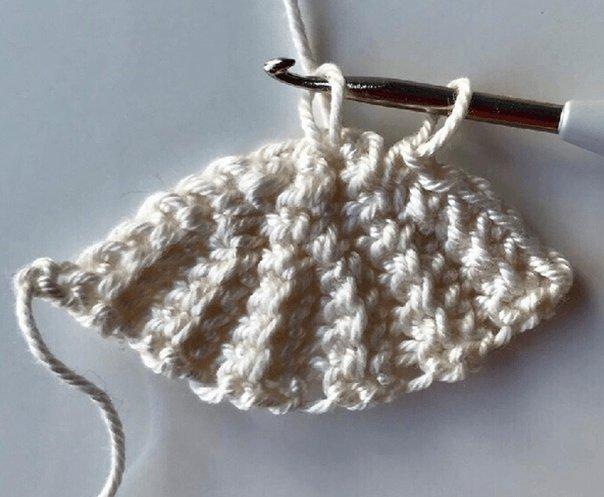 4) 4 сбн, 1 сбн (провязывается как обычно) в сс предыдущего ряда, 1 сбн (провязывается как обычно), 1 сбн (провязывается как обычно) в туже петлю что и сбн первого ряда, 1 вп (7 сбн).
