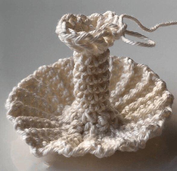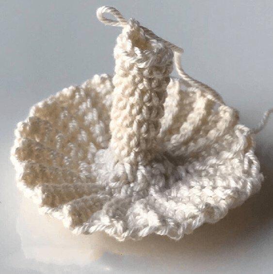 1) Вывернуть получившийся круг на лицевую сторону и начать вязать ножку нитью белого цвета. Для этого в центре круга связать 8 сбн, если их получается больше убавить до 8 сбн.