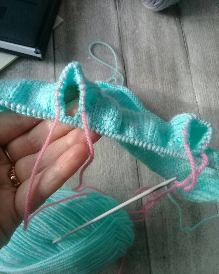 ✅затем снимаем петли рукава на отдельные нити или булавки по 18 петель.