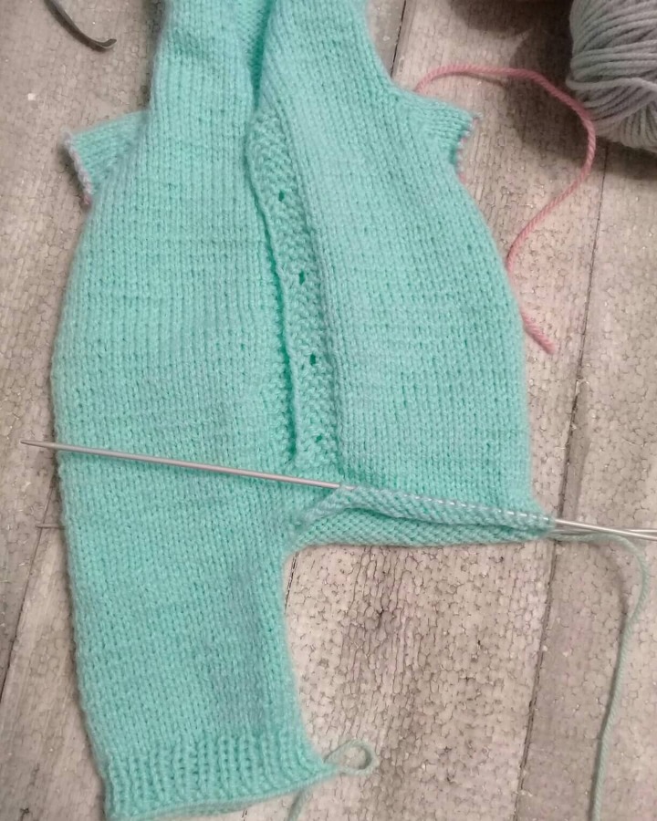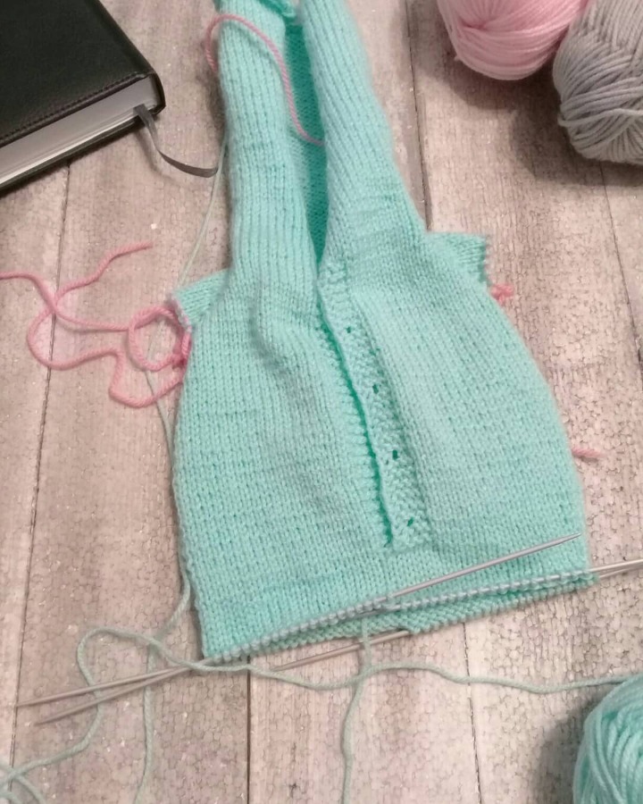 ✅Вяжем до нужной длины лицевой гладью, первые 4петли и последние 4 петли платочной вязкой. И одновременно через каждые 10-12 рядов делаем отверстие для пуговиц ( кр, 2петли вместе, накид)