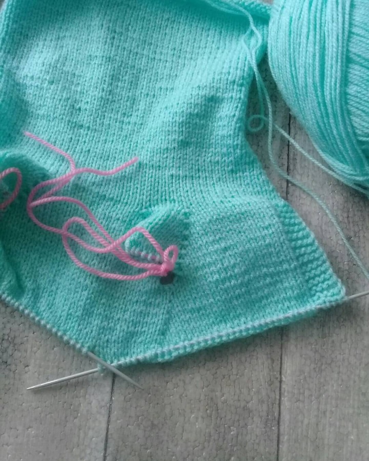 И далее делаем по одной прибавке под рукавами (5 раз в лицевых рядах, итого плюсом получится 10 петель)