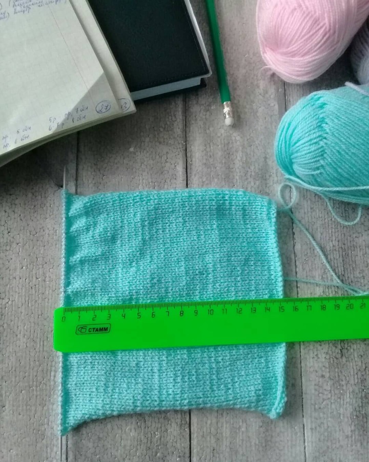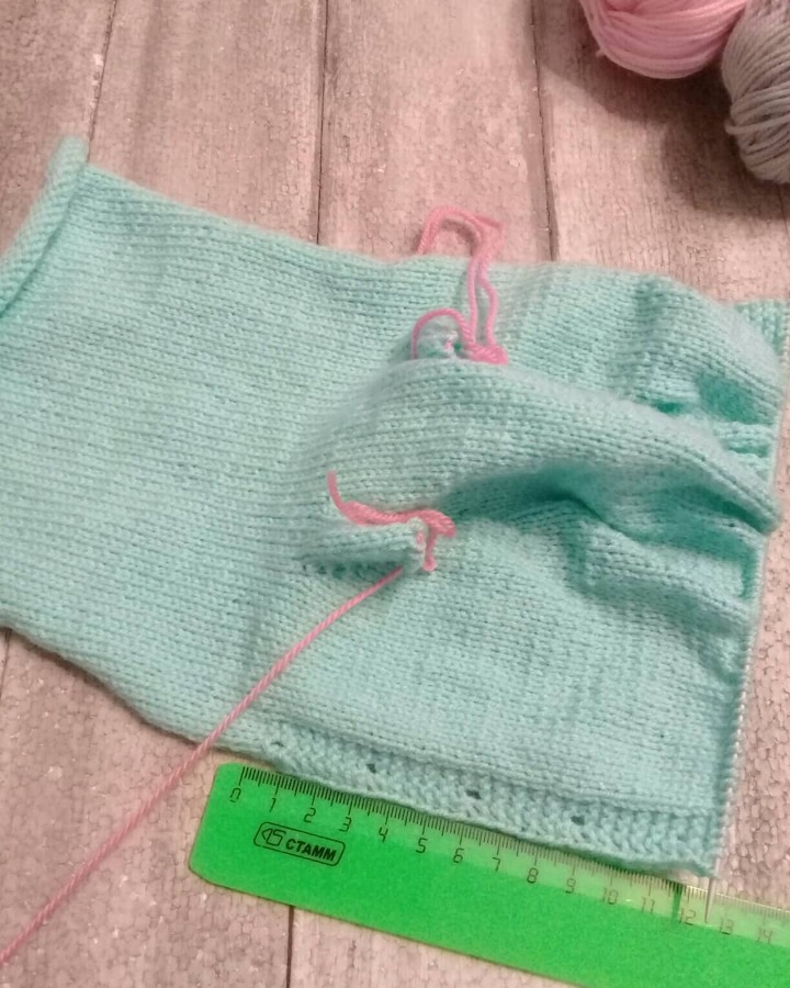 Сначала провязываем одну штанину до нужной длины, у меня 20рядов лицевой гладью и 6 рядов резинка 1:1