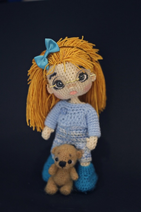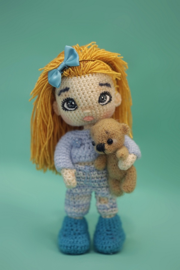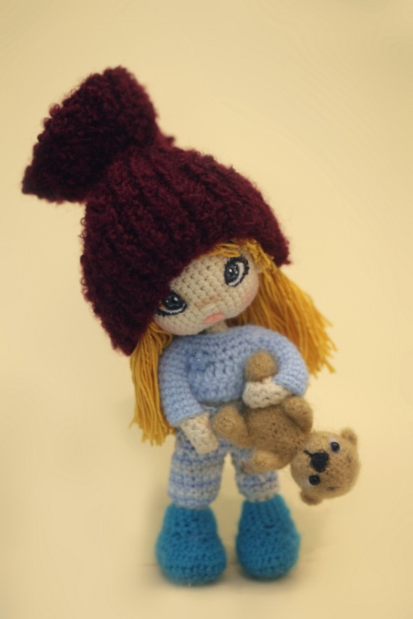 Штанишки и кофточку вязала вокруг куколки. Шапочку вязала спицами.