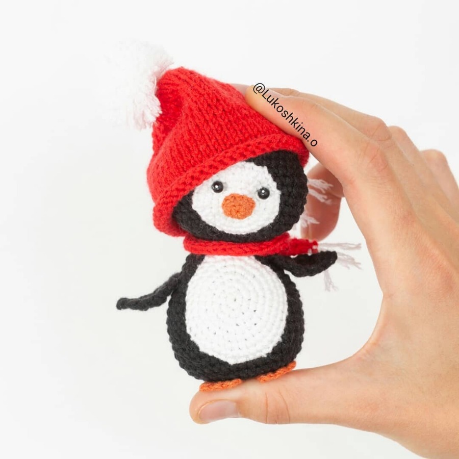 Здесь приведена схема вязания пингвина крючком. Шапочка и шарфик вяжутся спицами, их описание автор не приводит.