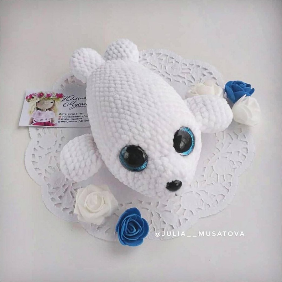 Для изготовления этого милого создания — плюшевого белька — понадобится полмотка пряжи Himalaya Dolphin Baby белого цвета и крючок №3. Размер готовой игрушки амигуруми около 20 см в длину. Смотрите авторское описание вязания детёныша тюленя отЮлии Мусатовой.