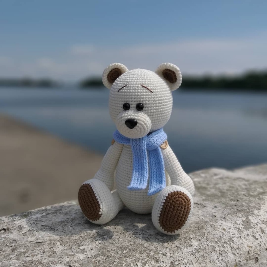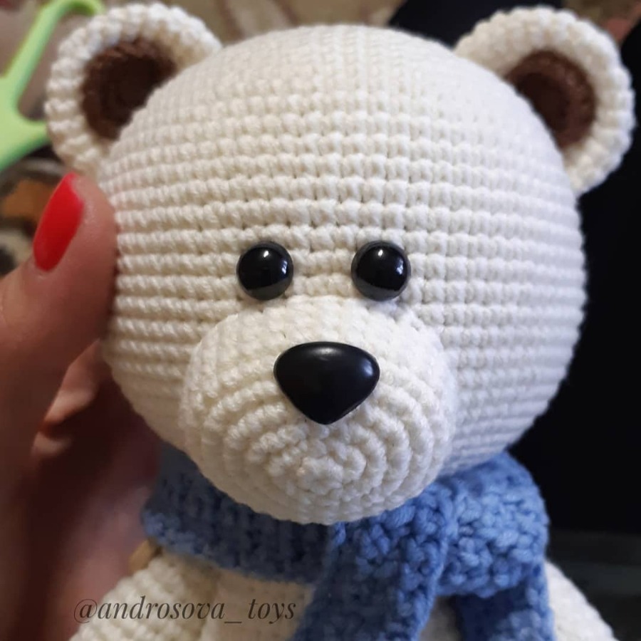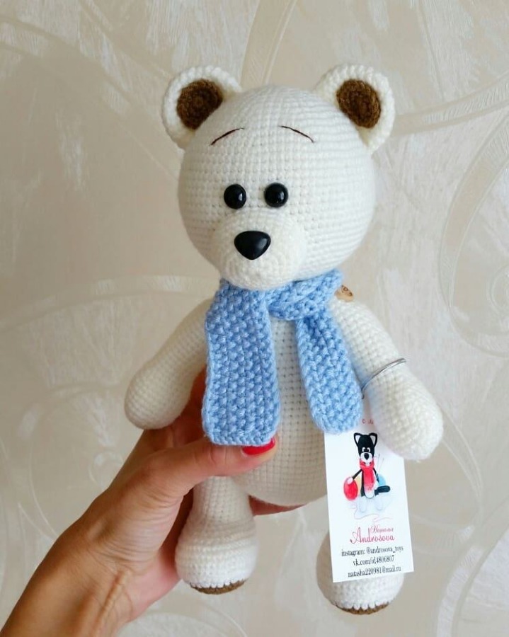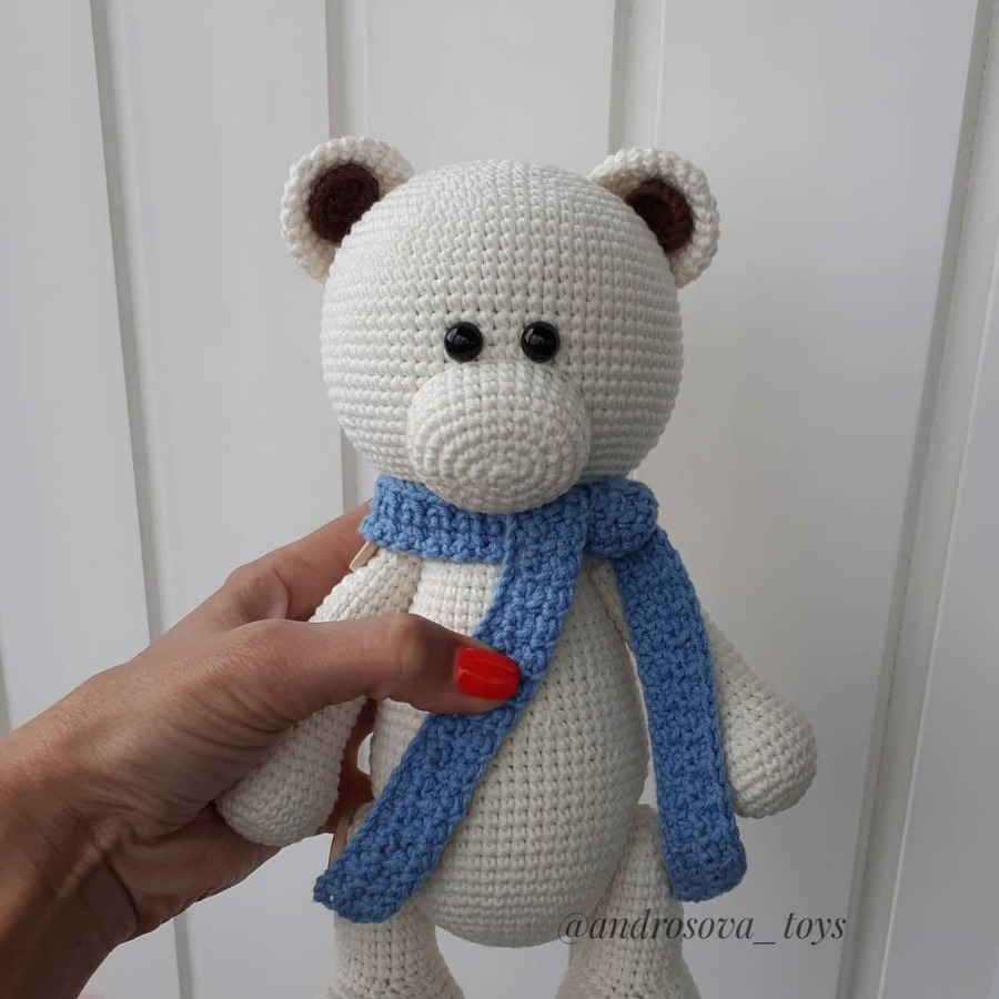 Очаровательный белый медвежонок амигуруми от Натальи Андросовой. Высота готового мишки около 20 см при использовании крючка №1.75 и пряжи YarnArt Jeans. Конечности у игрушки подвижны благодаря использованию пуговичного крепления.
