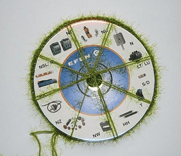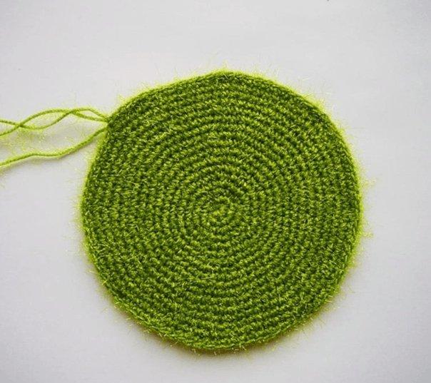 Диаметр плоского круга будет приблизительно как диаметр диска. У меня так получается. Если ваша плотность вязания будет отличаться, то всегда можно либо диск уменьшить по диаметру, либо из пластиковой папки вырезать круг, который мы потом подошьём к основанию для более утойчивого положения ёлки.
