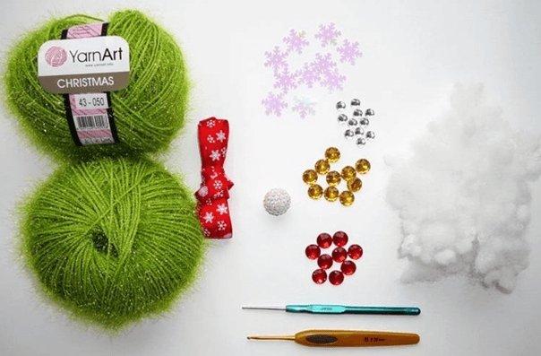 Для вязания и украшения ёлочки нам потребуются: пряжа «Ярн Арт Кристмас» ( 2-2,5 моточка по 50 г в зависимости от того, какой высоты будет ваша ёлочка), крючки (я использовала крючок 1,9 для конусовидной основы ёлочки и вязания донышка и крючок 2,25 для вязания веточек ёлочки), синтетический наполнитель, старый ненужный диск, стразы, ленты, пайетки, крупная бусина и другие виды материалов для украшения.