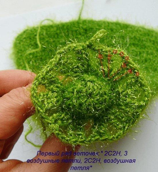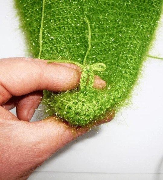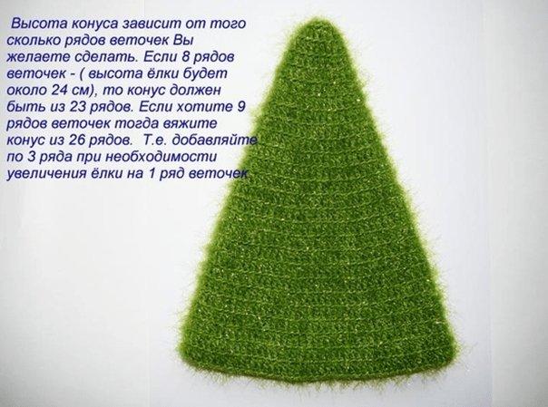 Веточки состоят из 2 рядов. Навязывать будем их на каждый третий ряд конусовидной основы. Первая веточка вяжется на второй линии от верхушки ёлки. Обратите внимание, что в первом ряду вяжем столбики с 2 накидами. Это надо для того, чтобы наши веточки максимально перекрывали основу конуса, т.е. мы за счёт столбиков с 2 накидами в первом ряду веточек делаем веточки более длинными.