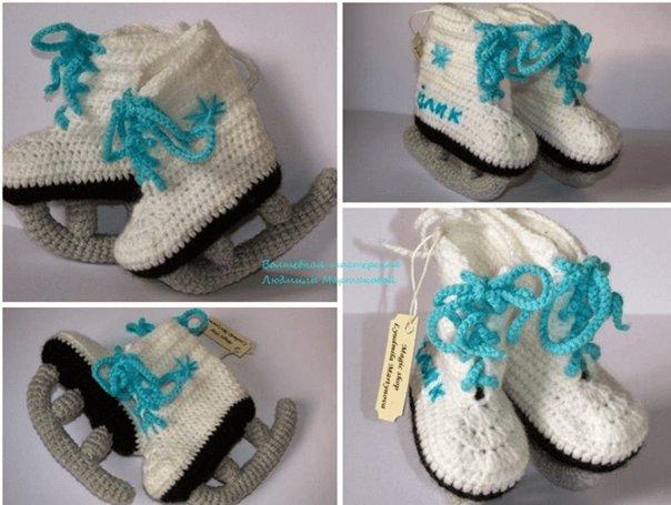 Для шнурочка набираем около 200 в.п, и провязываем ряд соединительных столбиков. Вдеваем шнурочки в ботиночки. И вот, коньки готовы.